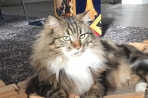 Description :Chat européen/norvégien, poil mi-long, yeux jaunes/verts, poitrail et chaussettes blanches