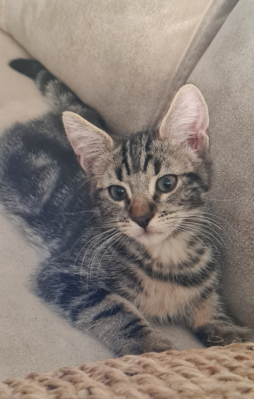 Description :Gentil petit chat d'1 an 1/2. Tigré, de petite taille avec de grosses pattes et coussinets noirs