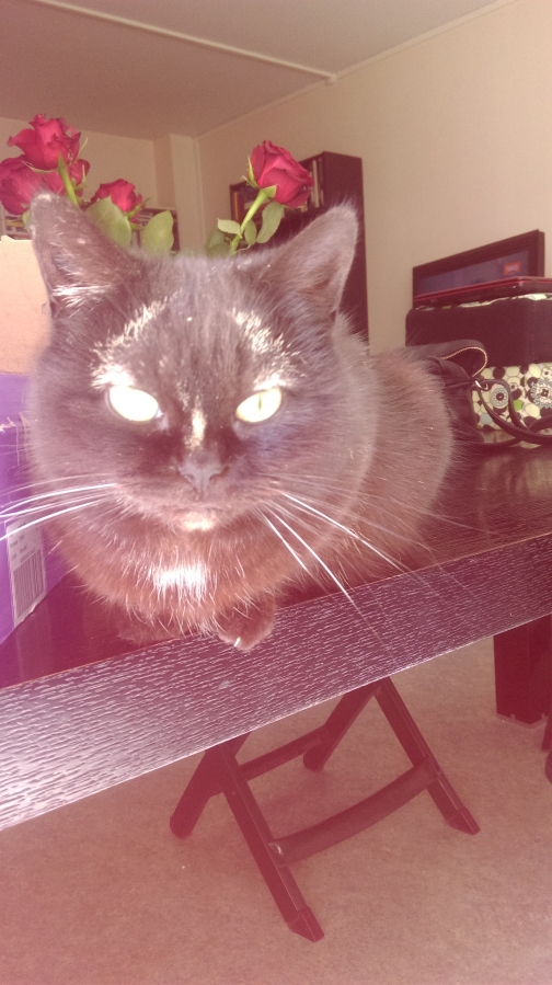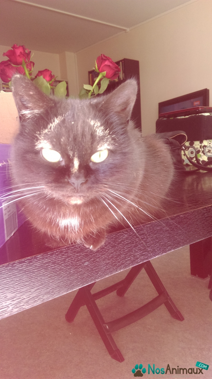 Description :Chat noir avec des petites cornes blanches au dessus des yeux, chat de petite taille.