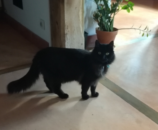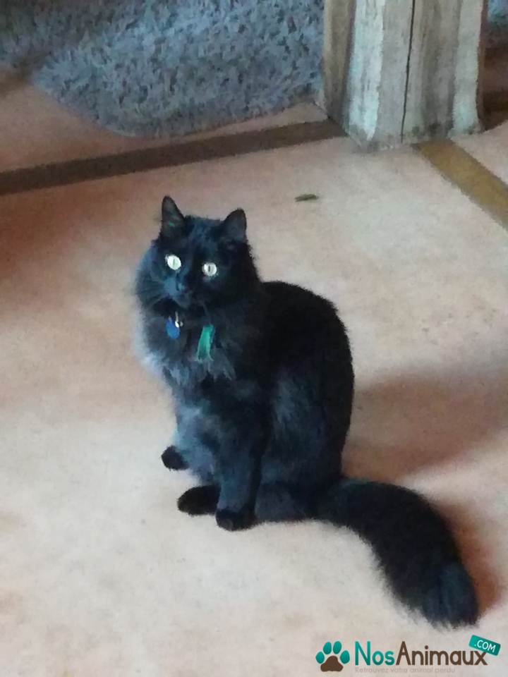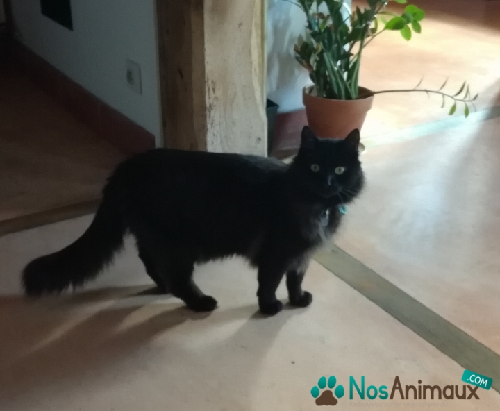 Description :Chat mâle castré, noir à poils longs, porte un collier vert et un pendentif avec numéro de téléphone au dos. Très gentil.