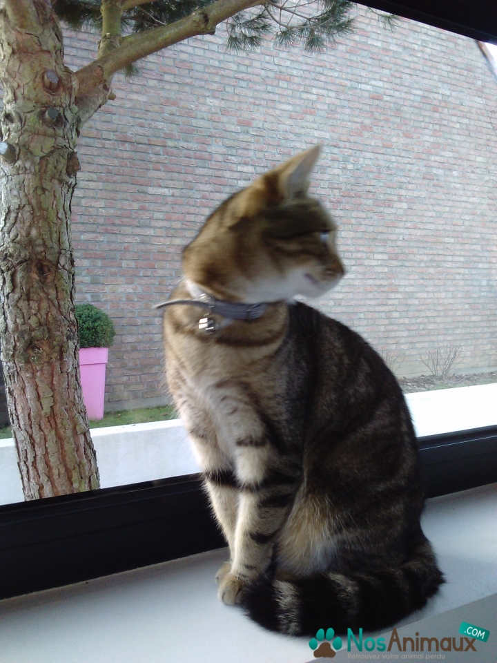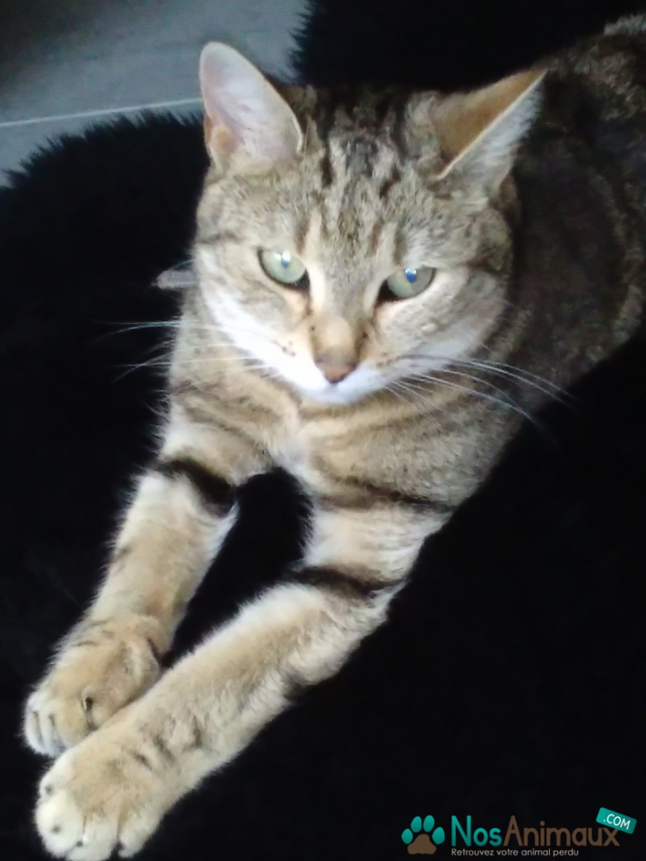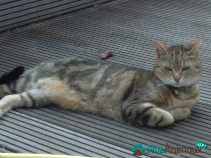 Description :Avons vu pour la dernière fois notre petite chatte sur notre terrasse vers 22 heures. Frimousse est fine. Elle aime les caresses mais ne se laisse pas facilement attrapée, ne répond pas vraiment à l'appel de son nom. Le bas de sa gueule est blanc et elle a une touffe de poils un peu roux sur le ventre.