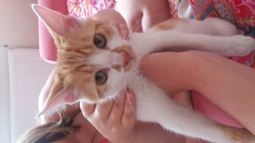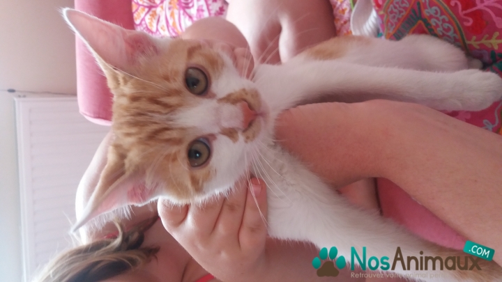 Description :Jeune chaton mâle blanc roux non pucé. Museau roux. Yeux orangés/bruns/verts