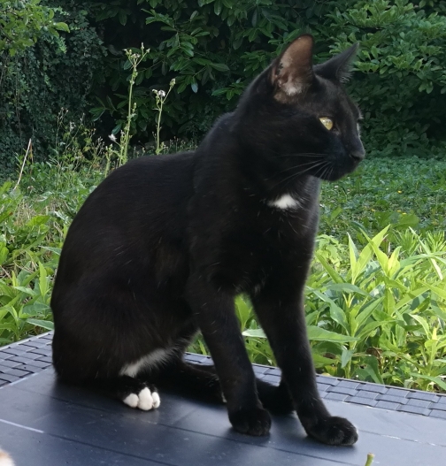 Description :Noir avec un peu de blanc au cou et au bout des pattes arrière. Animal doux mais craintif.