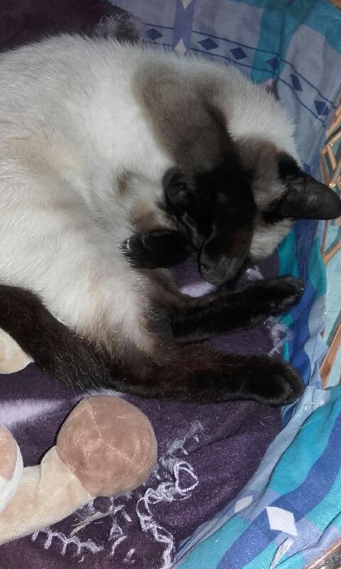 Signe particulier: tâche rose sous la patte avant droite avec coussinet rose au même endroit que la tâche parmi tous les autres noirs