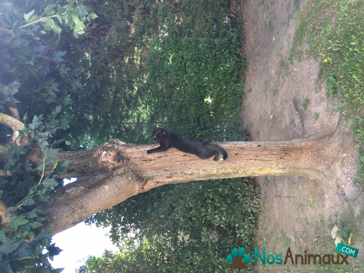 Description :Jeune chat, un peu moins d'un an je dirais. Il a une tâche blanche sur le poitrail et le bout de la queue blanche. Il est très très sociable et se laisse attraper. Il porte un collier antipuce orange/rouge. Il est assez maigre et affamé, je l'ai nourri. Il a tendance à me suivre et miaule à m'en briser le cœur. Il a l'air reconnaissant d'être avec quelquun. Je ne peux malheureusement pas le prendre chez moi. Il est actuellement dans un jardin, d'une maison fermée. Il aurait deja ete trouve' aussi Rue Henri Lavedan mais avait été relâché.