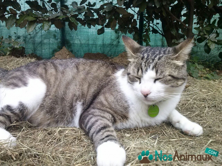 Couleur :gris rayé noir dessous et visage blanc et patte gauche blanche