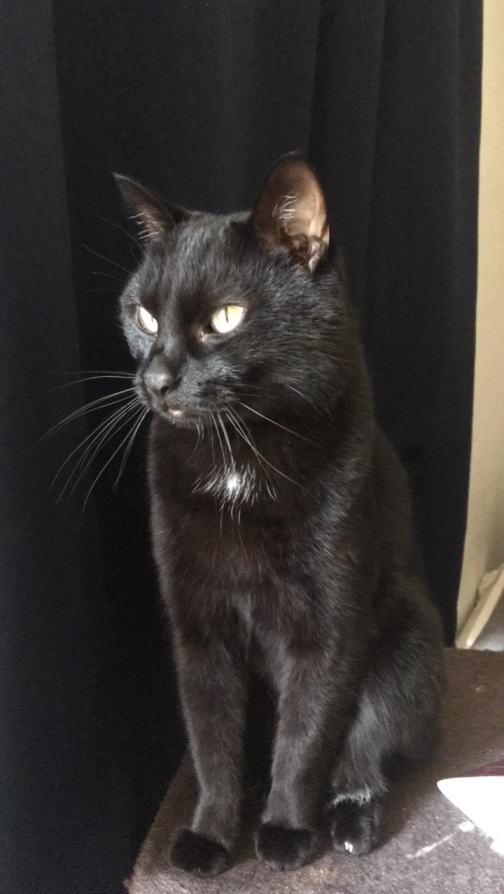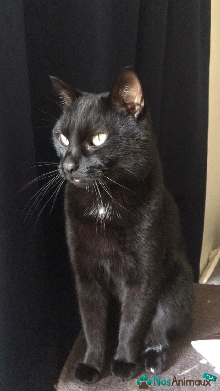 Description :chat noir tache blanche sur le col, grande taille, yeux verts.