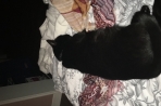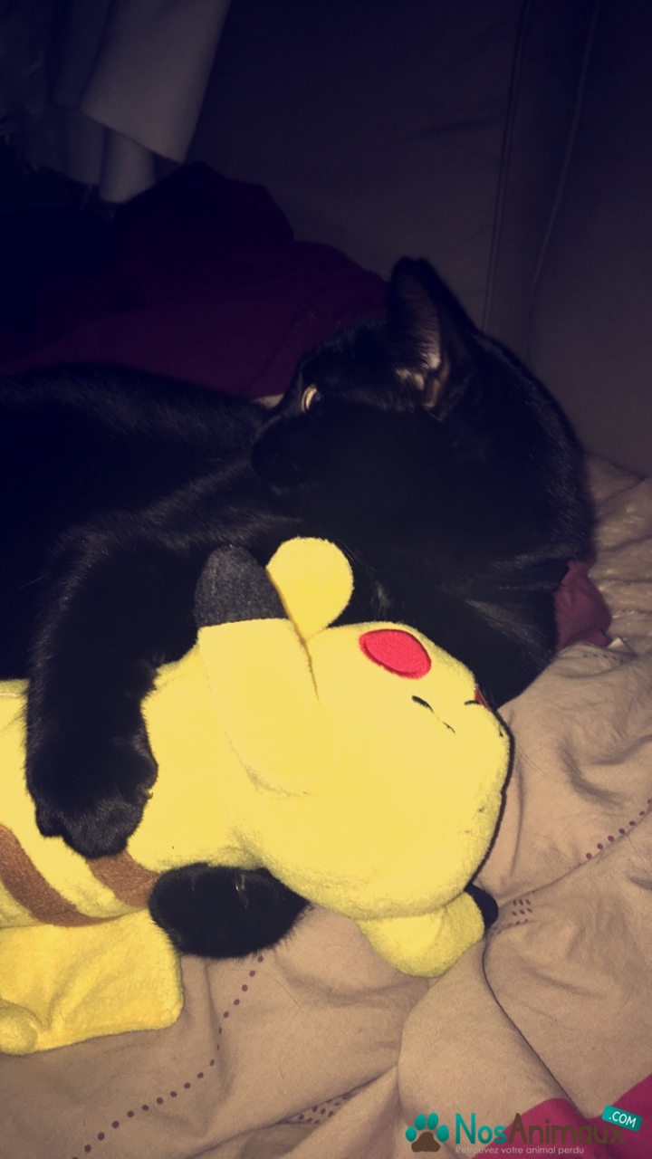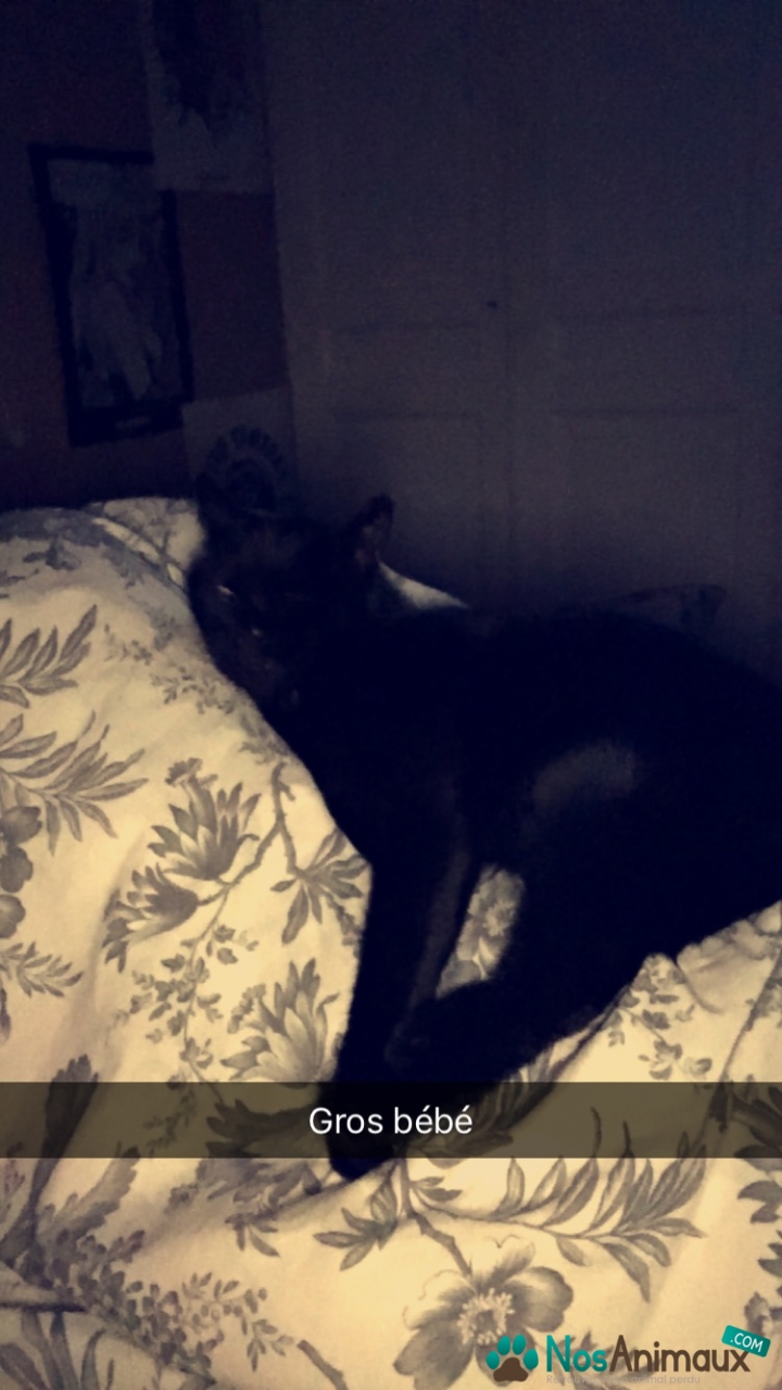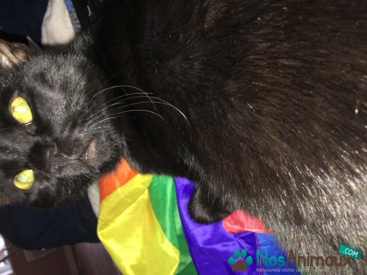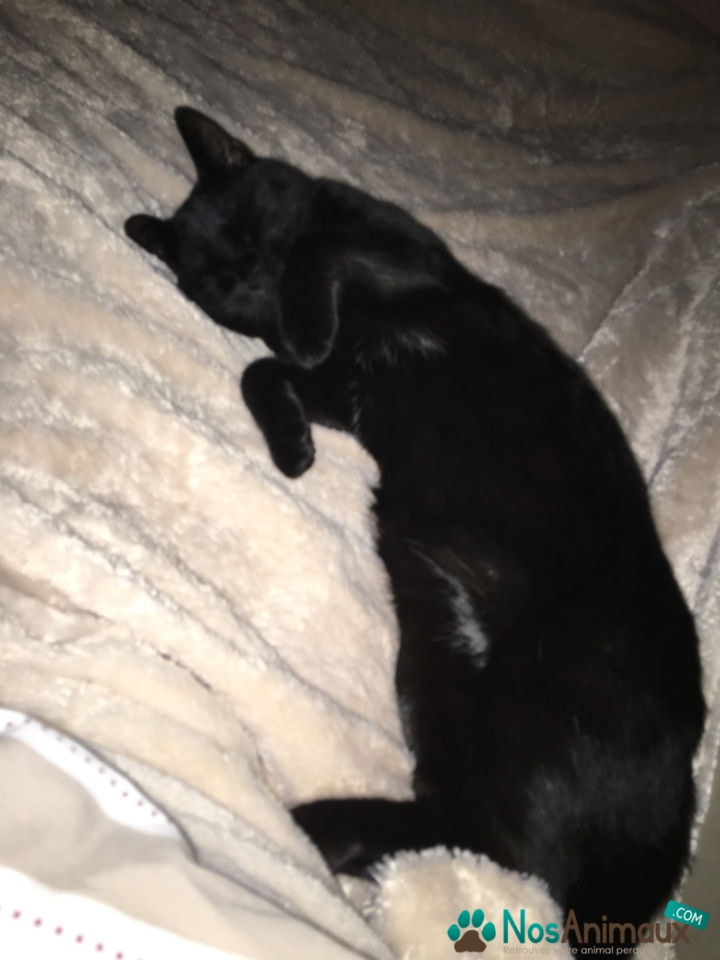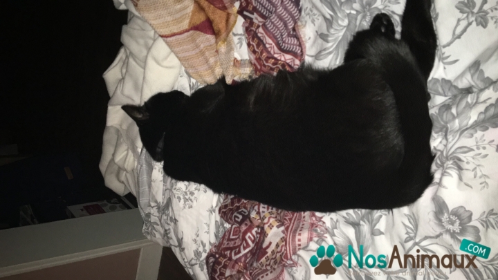 Couleur :Noir avec de petite souris taches blanches sur le cou sous ses deux’ pates avant et sur son ventre