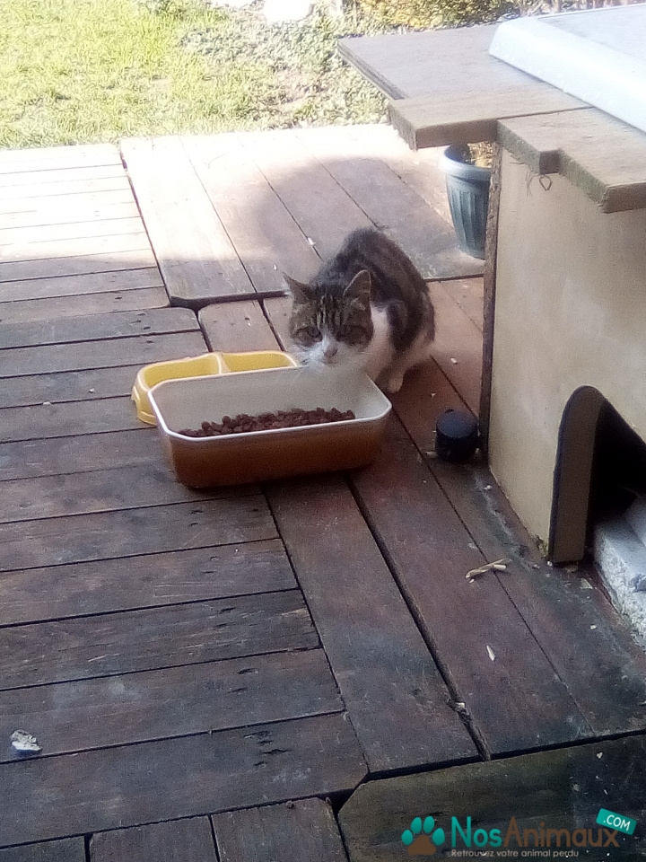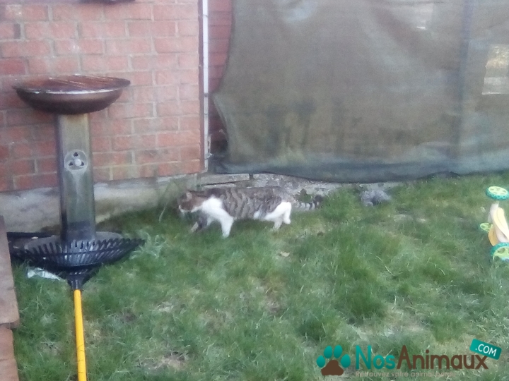 Description :Trouve à Vendeville le 16/02/18 chat assez maigre vient se nourrir chez nous mais nos chats le chasse. Bout des pattes blanc une tache blanche sur le dos. Tigré gris et marron pour le reste du corps