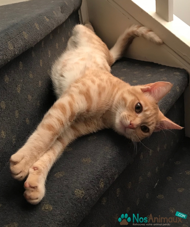 Bernard est un chat mâle, le pelage majoritairement roux et un peu de blanc. Il ne porte pas de collier mais il est pucé, vacciné et stérilisé.