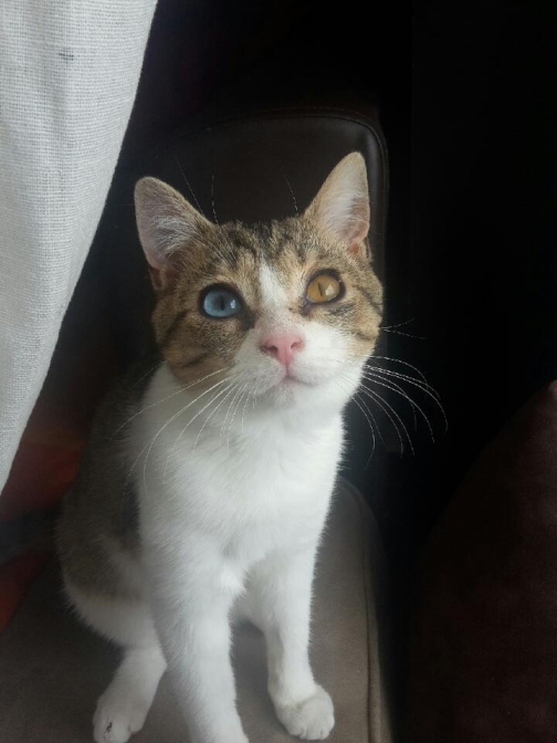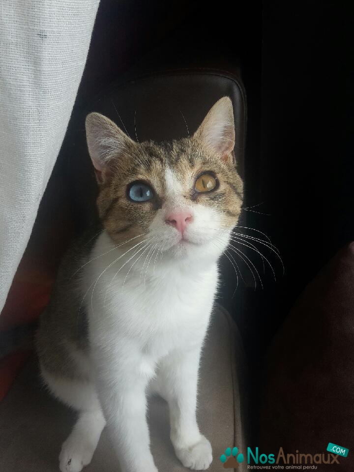 Description :Blanc tigré, craintif, jeune et joueur, aime les câlins, chat aux yeux vairons.