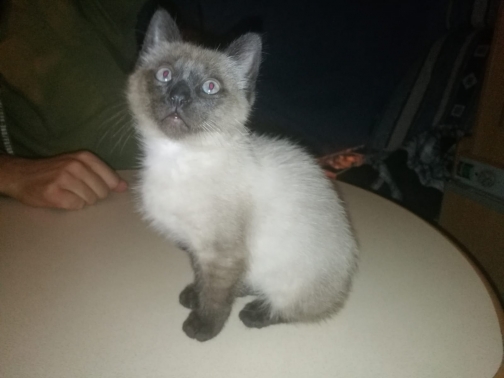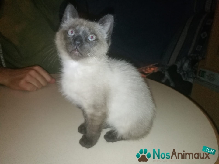 Description :chat de deux mois nommé jack. Couleur grise. Mousse, oreilles, pattes et queue noires, yeux bleus.