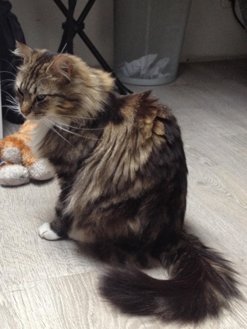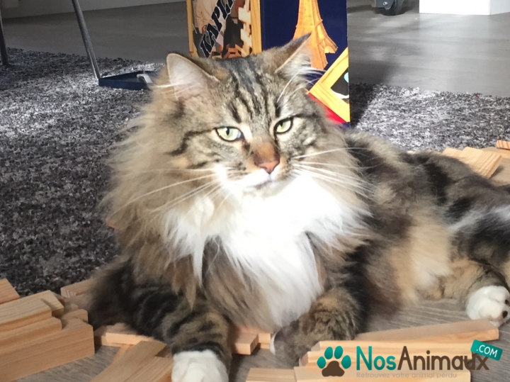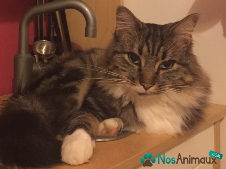 Description :Chat européen/norvégien, poil mi-long, yeux jaunes/verts, poitrail et chaussettes blanches
