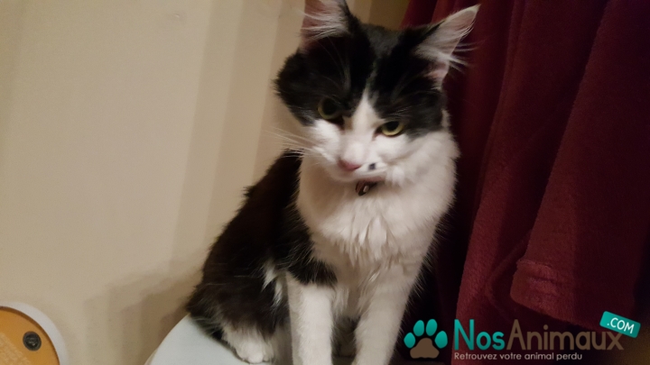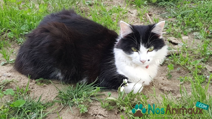 Description :Oreilles blanches.pelage long noir et blanc.yeux verts.queue noire.trés joueuse