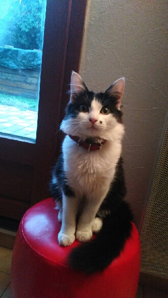 Description :Jeune chatte noire et blanche.stérilisée.oreilles blanches.poils longs.collier rose.tache noire à coté du museau.
