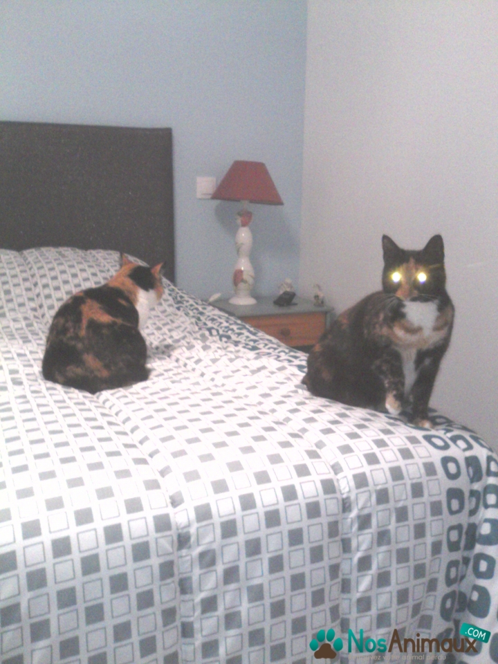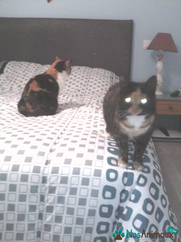 Description :Elle porte un collier anti-puce muni d'un élastique. Elle a aussi le ventre qui pend. Elle a de magnifique yeux verts. Quant elle miaule, son miaulement est très aiguë. Elle est très câline. ELLE EST STÉRILISÉE.
