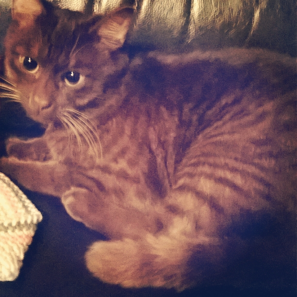 Description :Chat marron avec de grands yeux vert tigré comme un chat de goutiere