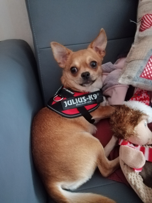 Description :Petit chien avec un collier vert à clochette il porte également un harnais rouge "Julius".