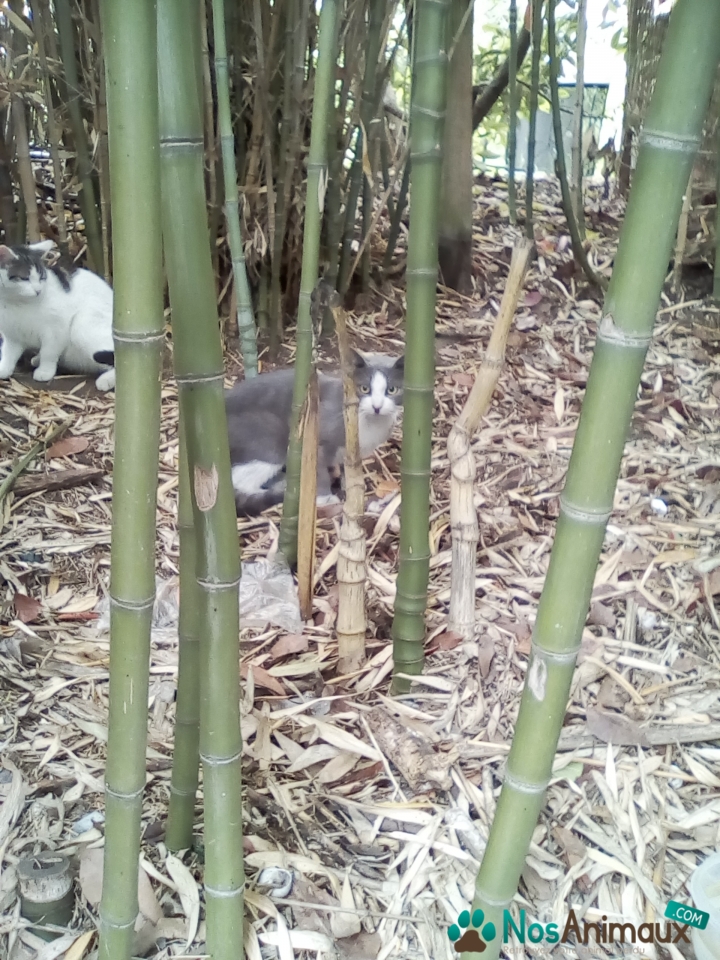 Description :Jeune chat gris/blanc docile trouvé dans le parking du lycée professionnel des Menuts pendant les vacances scolaire. Il actuellement à coté du parking dans un jardin avec d'autres chats errants.