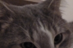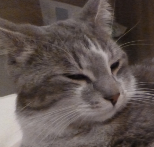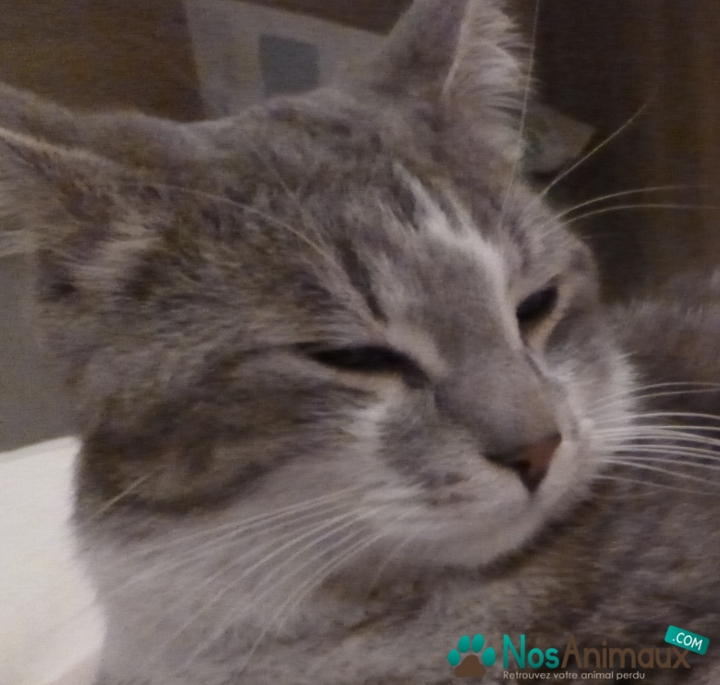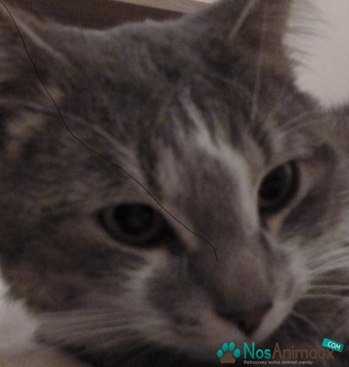 Description :Matou au poils mi longs gris tigré et blanc sur le ventre et cou.