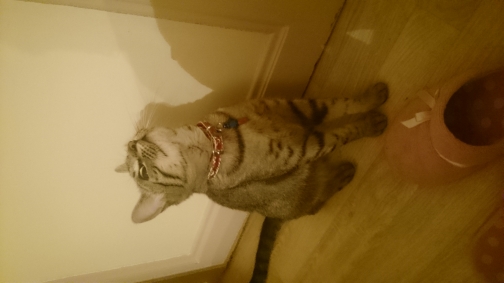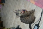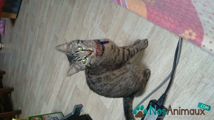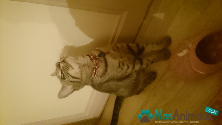 Description :Chatte tigrée de 9 mois portant un collier rouge avec une capsule ayant le numéro de téléphone et adresse