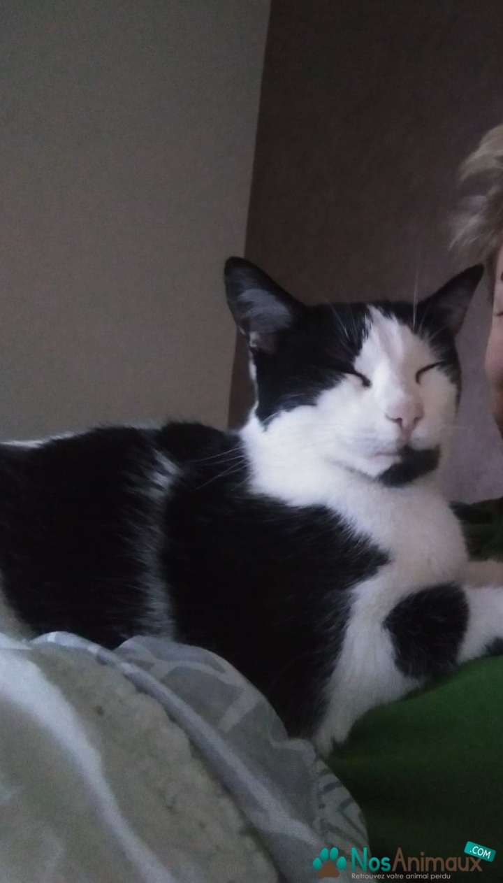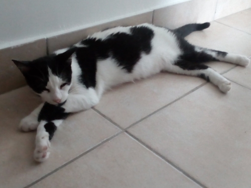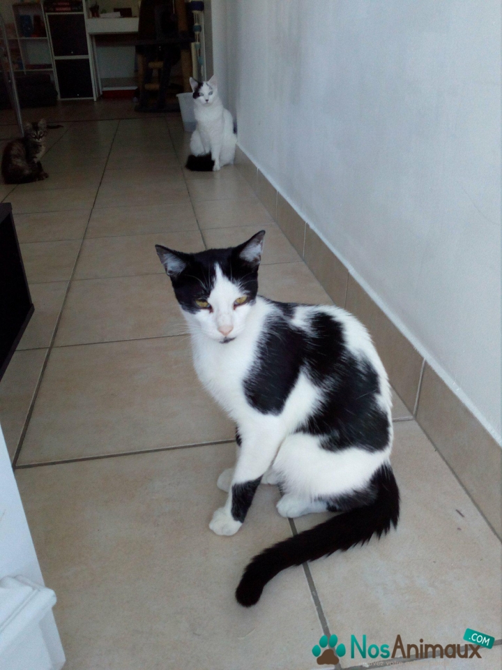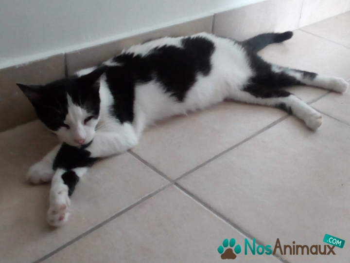 Chatte noire et blanche au poils courts, yeux dorés foncé/verts. Ventre blanc, elle a une tache qui se finit en coeur sur son flanc gauche. Du noire aussi au menton ce qui lui donne une impression barbue. Elle a aussi des taches noires aux " poignets ". La majeure partie de sa tete est noire, sa queue l'est entièrement.