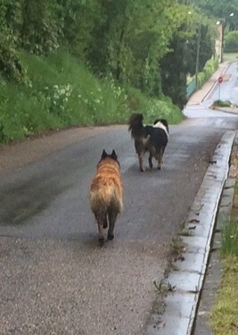 Description :Vu ce jour à 9h15 du matin, 1 Berger Australien et 1 Berger Belge Tervueren trottant ensemble remontant le chemin des Bruyères.