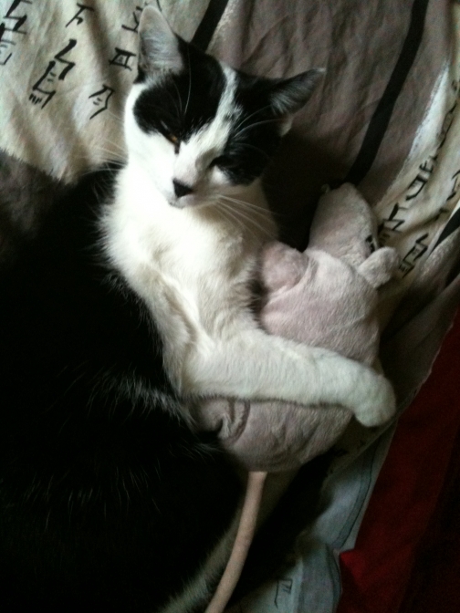 Description :Elle a la poitrine et les pattes avant blanche, sur la tête une raie blanche qui part du nez, et une toute petite tâche noire au niveau du menton.