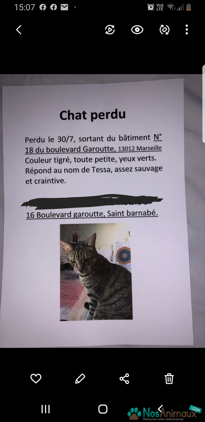 Description :Chat femelle petite de corpulence, croisée avec un bengal répondant au nom de Tessa, craintive et méfiante, elle est mouchetée marron rouille au ventre , avec des taches grisâtres, yeux vert, perdu dans le 12 eme arr de Marseille.