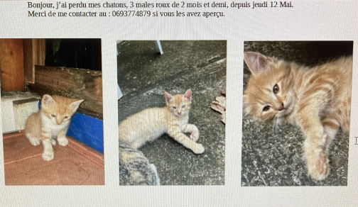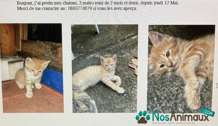 Description :Bjr, perdu 3 chatons mâles de deux mois et demi secteur ravine shenon