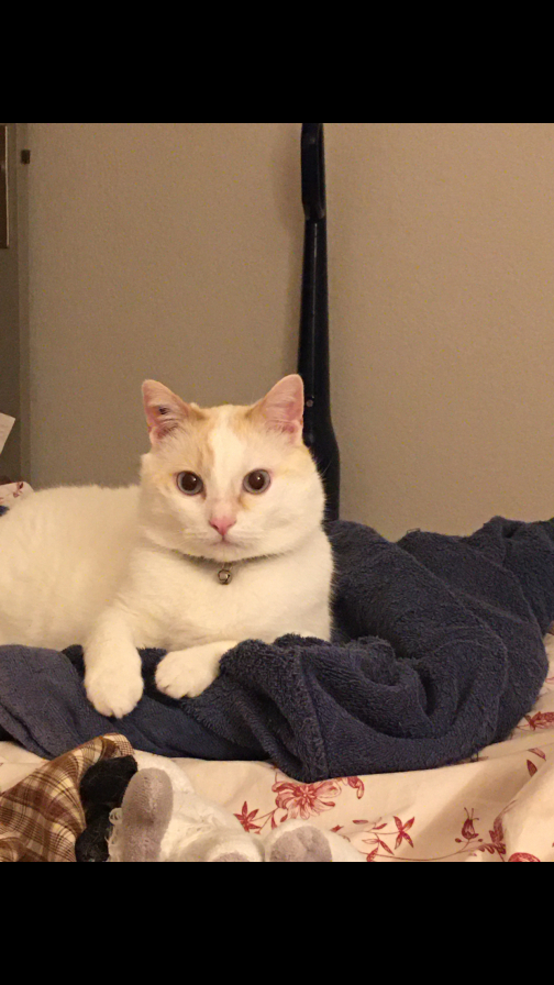 Description :Il porte un collier bleu avec une petite cloche, il n’a pas l’habitude d’être dehors