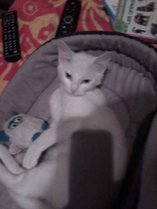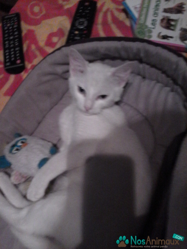 Description :chat blanc poil court yeux bleus non castré. collier orange avec clochette et tube adresse