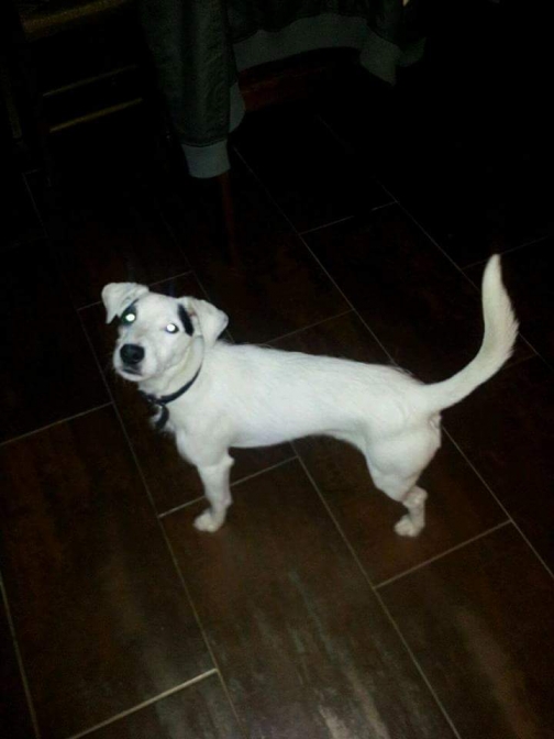 Couleur :blanc avec des taches noir dont une sur l'oeil