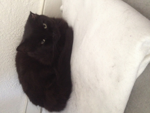 Description :CHATTE TRES CRAINTIVE AVEC UNE OREILLE GAUCHE ATROPHIEE. PELAGE DOUX MI-LONG NOIR, yeux verts perçants.