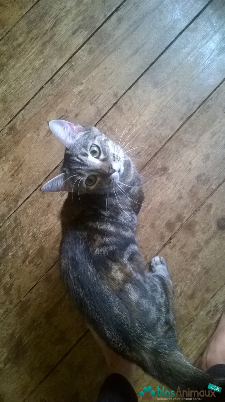Description :Pas de tatouage, trouvée ce matin dans la rue, affamée et apeurée. Très curieuse et câline.