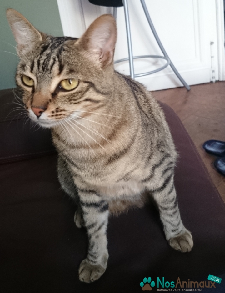 Description :Bobby est un chat adorable, très câlin. il miaule facilement. il est tigré noir marron et beige.