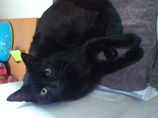 Description :Kéro est un grand chat noir, adorable est assez craintif.