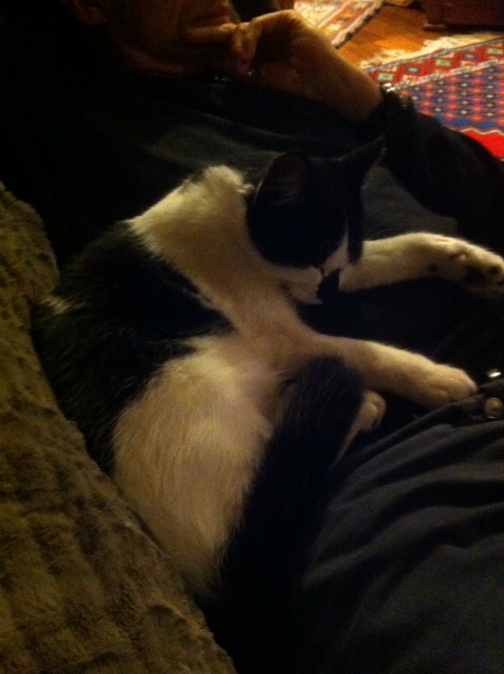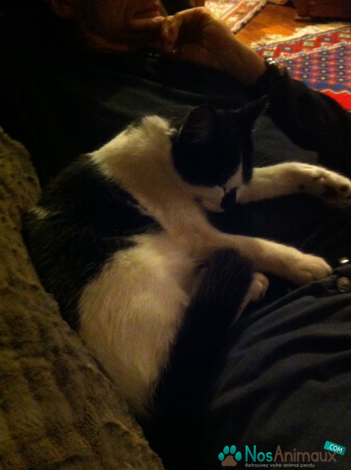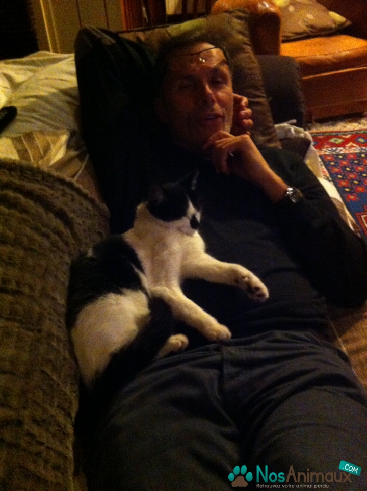 Description :Chat très câlin, jeune, noir et blanc avec une grosse tache noire sur le nez, semble en excellente santé, poil brillant et doux, bien nourri et confiant