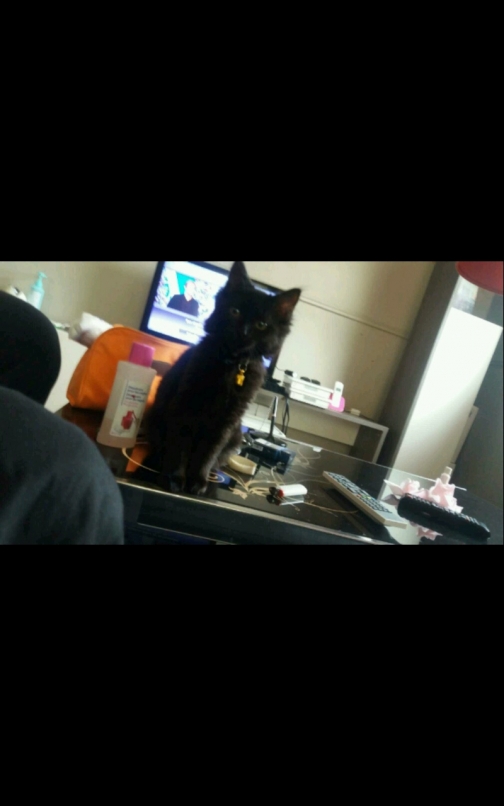 Description :Chat noir reflet maron au soleil yx vert taché de poil gris au nombril