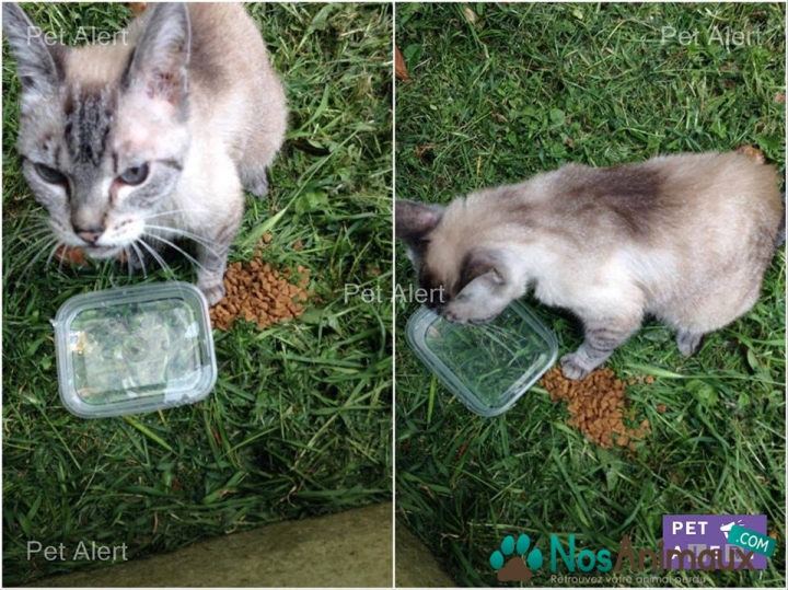 Description :Perdu place Simiot à Bordeaux le jeudi 19 mai et vu pour la dernière fois rue Dubourdieu le vendredi 20. C'est un vieux chat, très maigre, castré mais non identifié. Il est blanc-gris avec des yeux très bleus.
