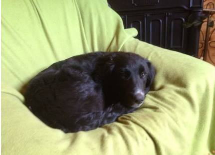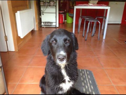 Labrador croisé border collie, de taille moyenne, couleur noire, pucée.