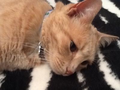 Description :Chat roux aux verts avec un collier violet et une médaille avec son nom et numéro de tel