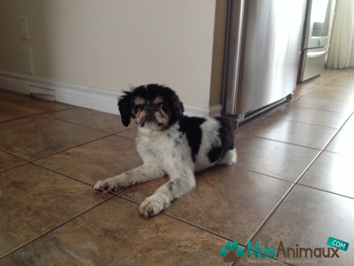 Description :C'est un épagneul nain anglais, pèse environ 10 livres(4 kg) un peu sourd et à moitié aveugle.