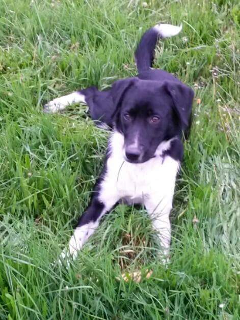 Description :Il à un collier noir en cuir abîmé et les pattes mouchetés