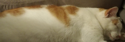 Description :Chat blanc avec des tâches de roux principalement sur le dos et une tâche de roux près de l’œil droit